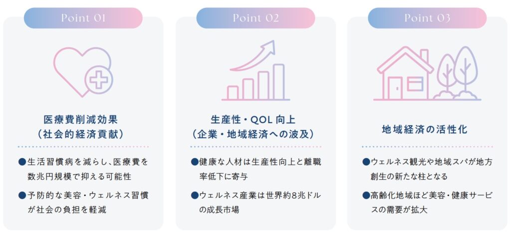 食事・運動・睡眠などの日々のセルフケアは、見た目を整えるだけでなく、病気を防ぎ、心身を健やかに保つ予防医療につながります。こうした意識が広がることで、医療費の削減や生産性向上など、社会全体にも大きな効果をもたらします。