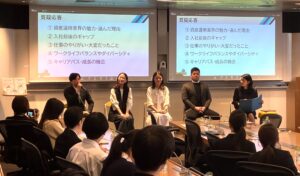 第二部の最後には参加者からの質問に答えてくださる時間がありました。資産運用業界で働く方は穏やかな人が多く感じるがそれはなぜか?という質問には、ストックからの収益であるために心に余裕を持てることや、目標が長期的だからではないかと返答されていました。確かに、パネリストの方々は話しぶりから仕事に情熱はあるものの、穏やかで優しい印象があったので納得の回答でした。また、この業界に入るまでにしておいた方がいいことは何か?という質問には、証券アナリストの資格を取得しておくのも良いと思うが、基本的には入社してからでも十分で先輩方から教えてもらえる、もしくは様々な国や価値観に触れて自分の幅を広げておくことが良い、と返されていました。これを聞いて、意外と資産運用業界で働くハードルは高くなく、頑張りたい気持ちがあればだれでも目指せる世界なのだなと感じました。