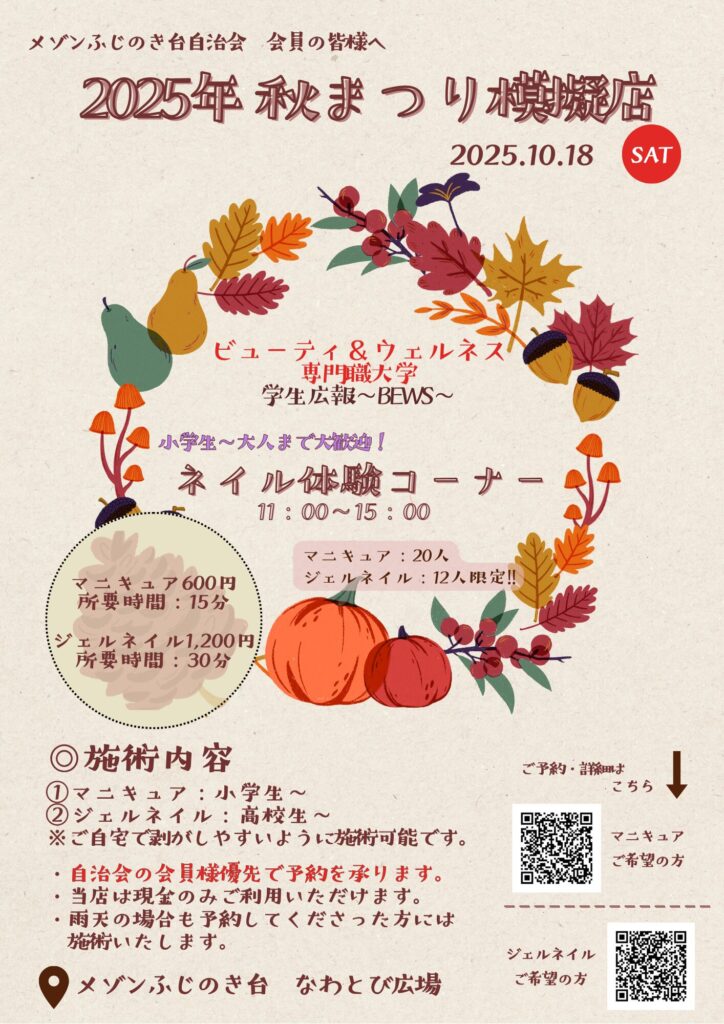 本学の学生広報「BEWS」のメンバーが、メゾンふじのき台自治会が担当する「なわとび広場」にてネイル体験ブースを出店し、地域の方々に美と癒しの時間を提供しました。