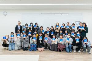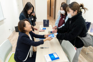 また、板橋社長のご厚意により、当日の参加学生には、著書『綺麗と算盤』およびスキンケアサンプルがプレゼントされました。