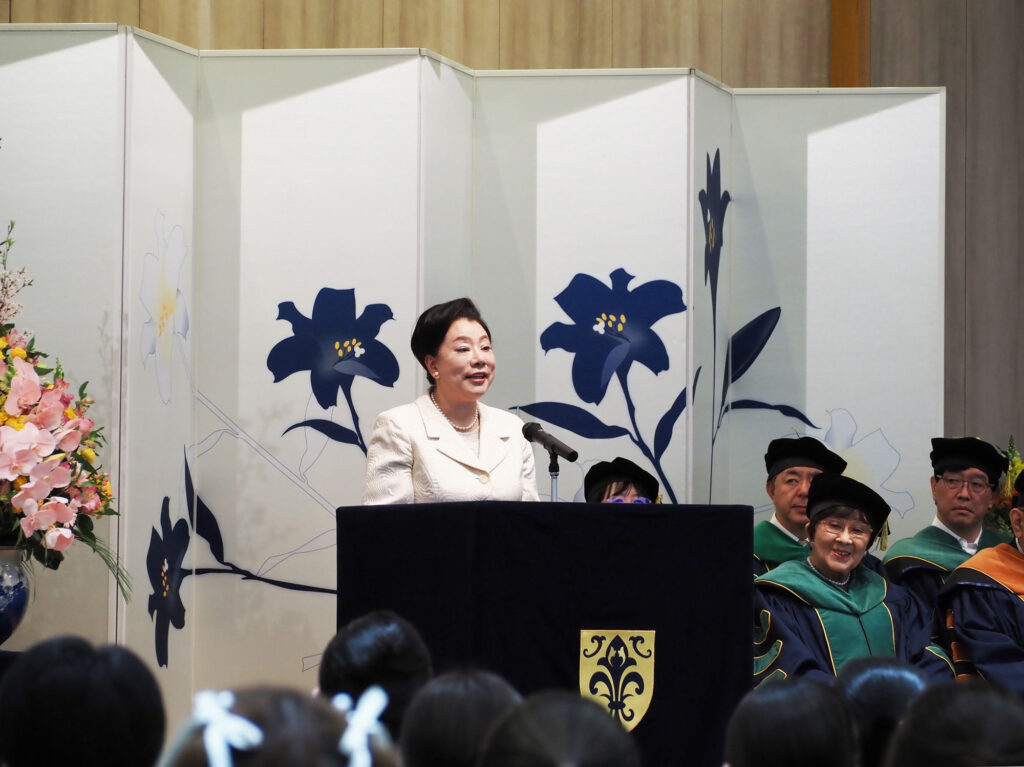 式典では、室伏きみ子学長が「心身の美と健康を科学し、人々の幸せに貢献できる人材へと成長してほしい」と式辞を述べました。あわせて、自らの可能性を信じ、仲間と支え合いながら学び続けることの大切さを新入生に伝えました。