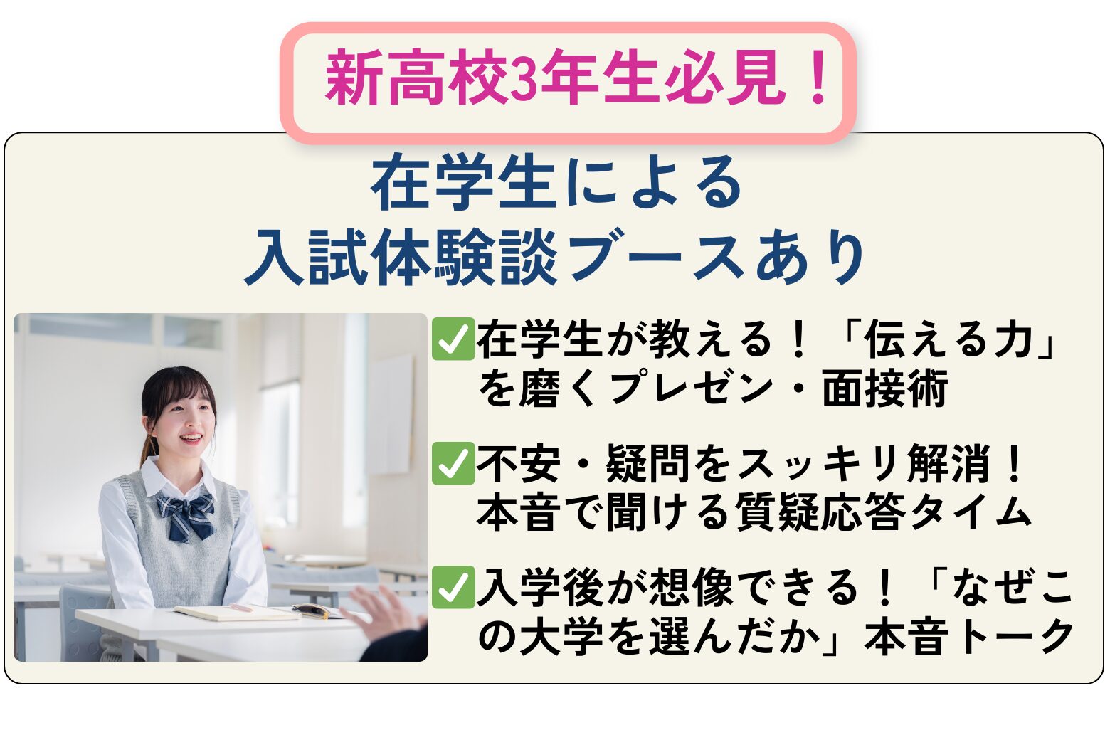 本学最新の学びの情報が掲載されている新パンフレットや、次年度入試に関する入試ガイドを春休み大型オープンキャンパスで全員に配布します。新高校2年生もいち早くゲットしよう!